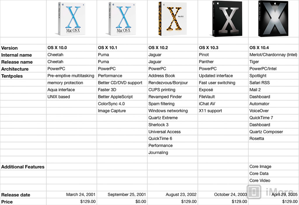 Puma y Jaguar fueron las siguientes versiones del sistema operativo. Estas versiones se centraron en mejorar el sistema operativo, pero no introdujeron mejoras o nuevas características realmente importantes. En este momento Apple llevaba un ritmo de una nueva versión al año, pero el lanzamiento de Panther (OS X 10.3) hizo que el ciclo de actualizaciones a versiones mayores aumentara a cada dos años.